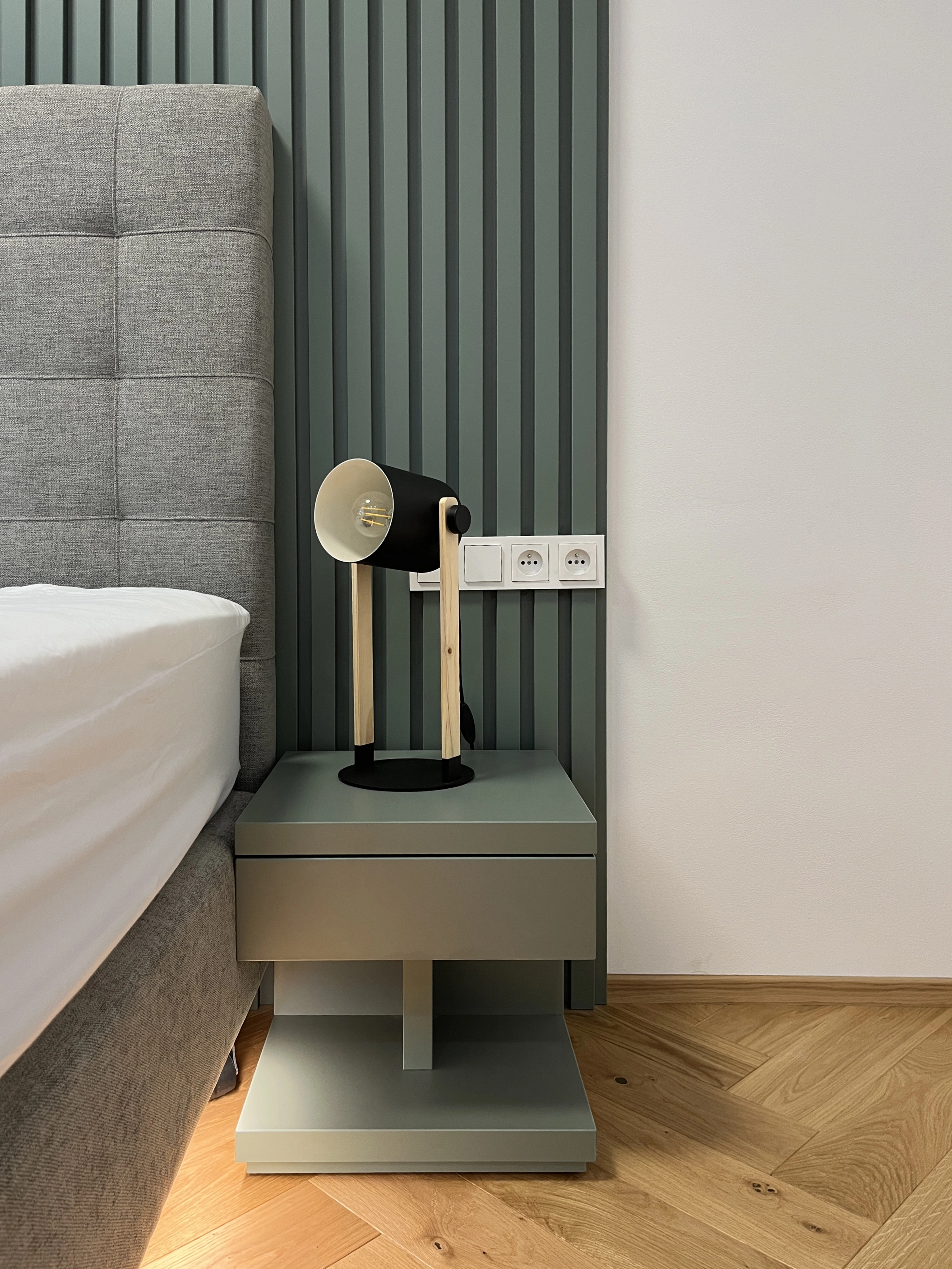 Vstupní dveře do bytů a zábradlí na hlavním schodišti jsou provedeny v zelené barvě. Ta se propisuje v bytových jednotkách v podobě nábytkových paravánů a lamelových obkladů stěn. Podlahy v bytech jsou dřevěné, kladené v parketovém vzoru. Celkově je design interiéru laděn v jemných světlých barvách v kombinaci s přírodním odstínem dřeva. Vzdušnost bytů dotváří skleněné dvoukřídlé interiérové dveře do hlavního obytného prostoru.