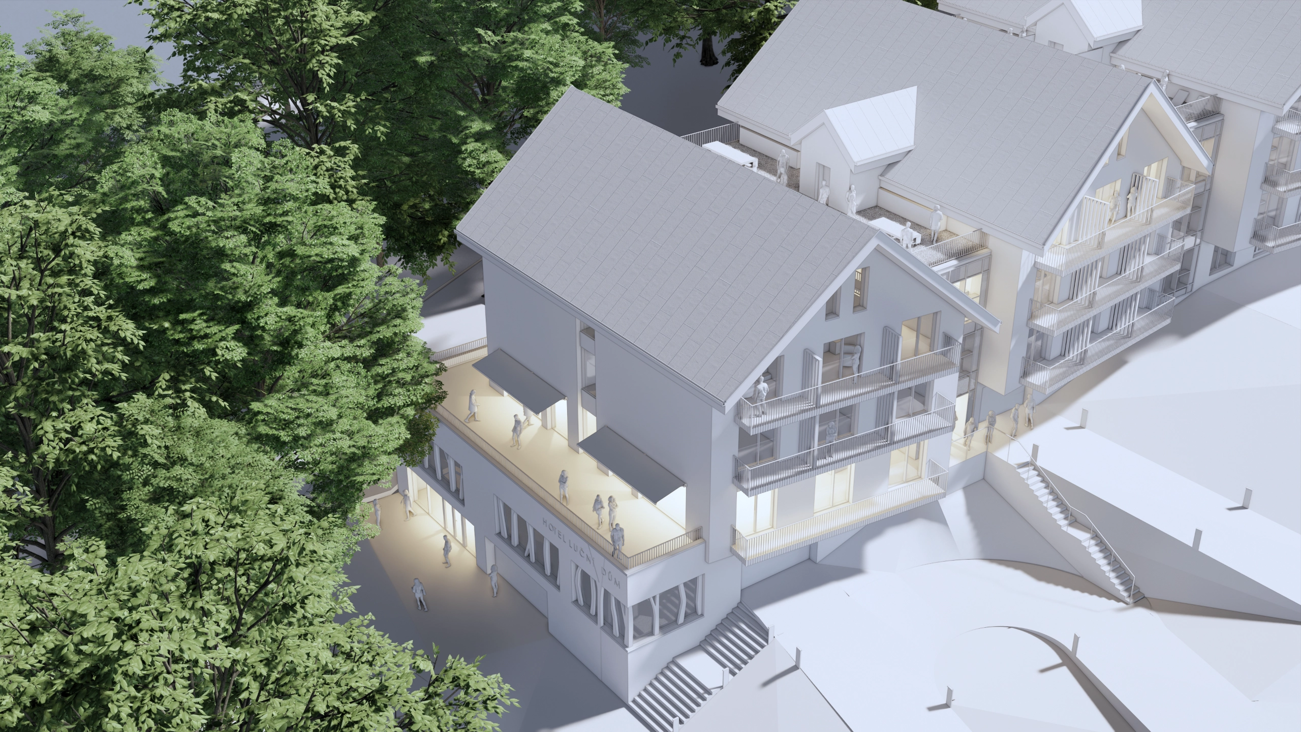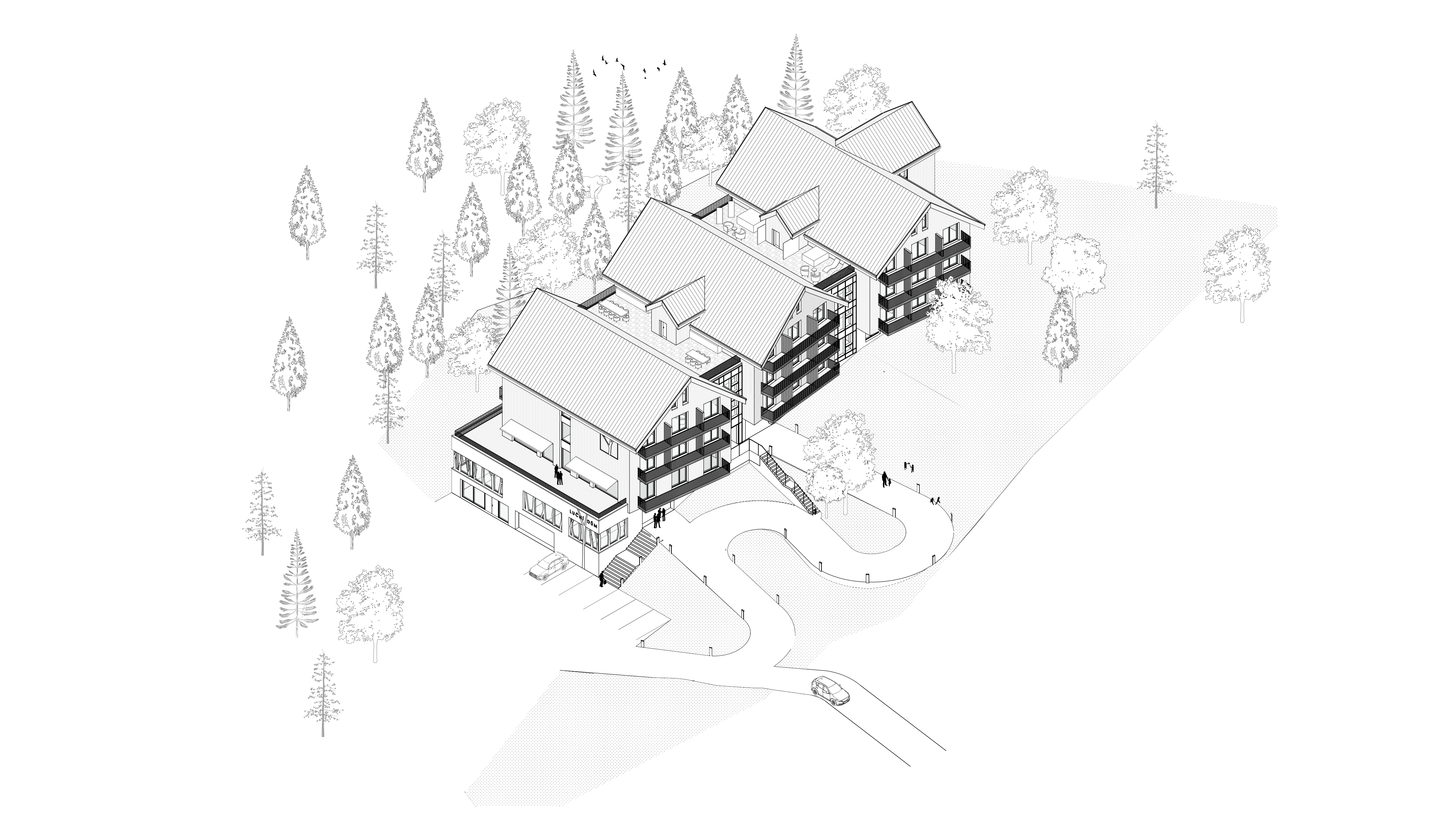 Nadzemní hmota objektu je rozdělena na tři “chalupy” s propojujícími krčky osazené na podnoži a postupně stoupajícími se svahem. Díky tomu působí měřítko objektu v kontextu okolní zástavby příjemným dojmem. Hlavní přístup do objektu je z obslužné komunikace na jižní hranici pozemku, která je zároveň nejnižším bodem. Na ni se napojuje odbočka komunikace vinoucí se svahem pro příjezd k parkovacím podlažím objektu a také k hlavnímu vstupu. Funkčně se jedná o princip self-check hotelu s recepcí a samoobslužnou restaurací. V severní části pozemku je mezi zelení navrženo lesní wellness pro ubytované.
