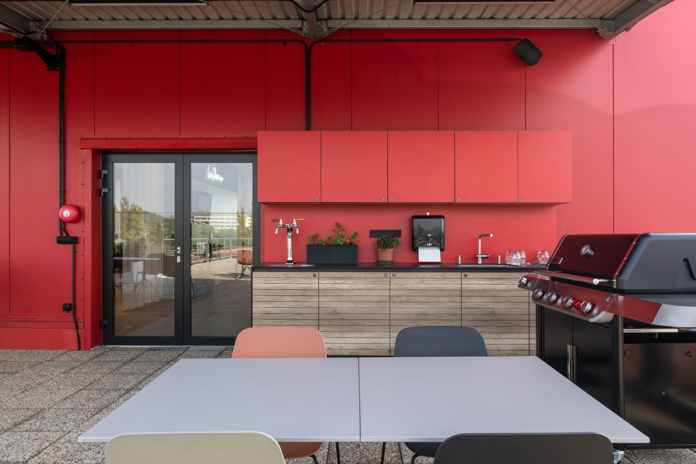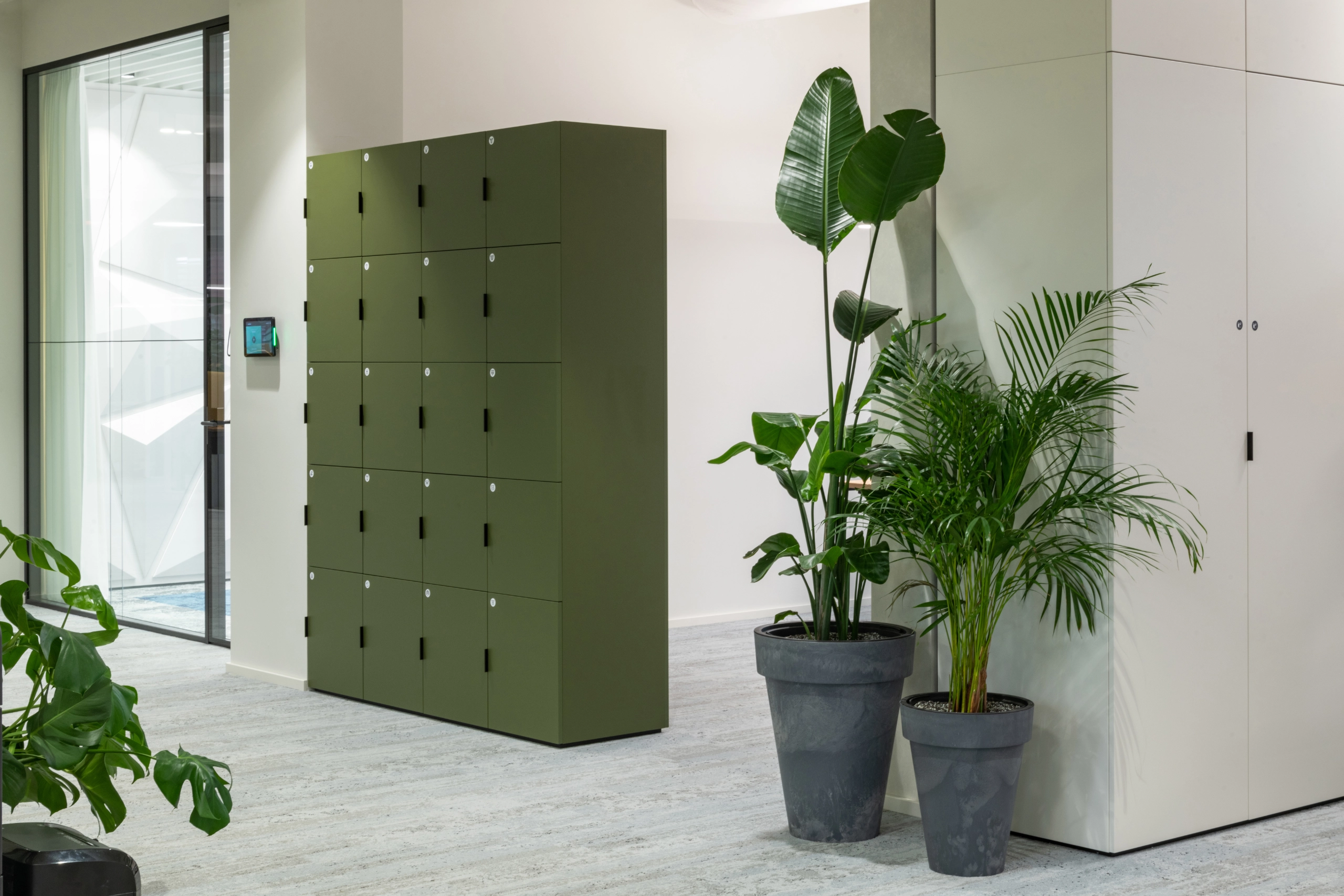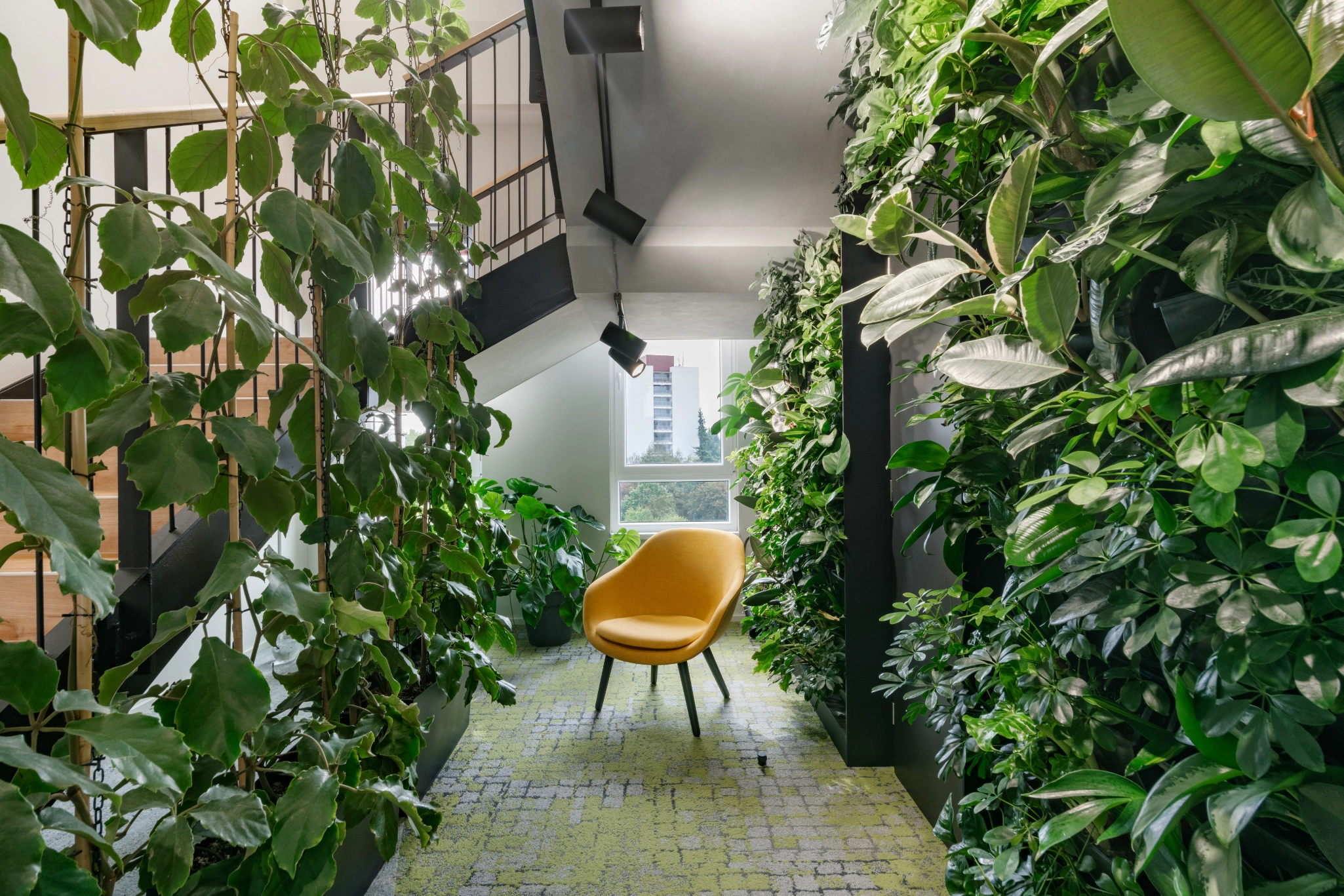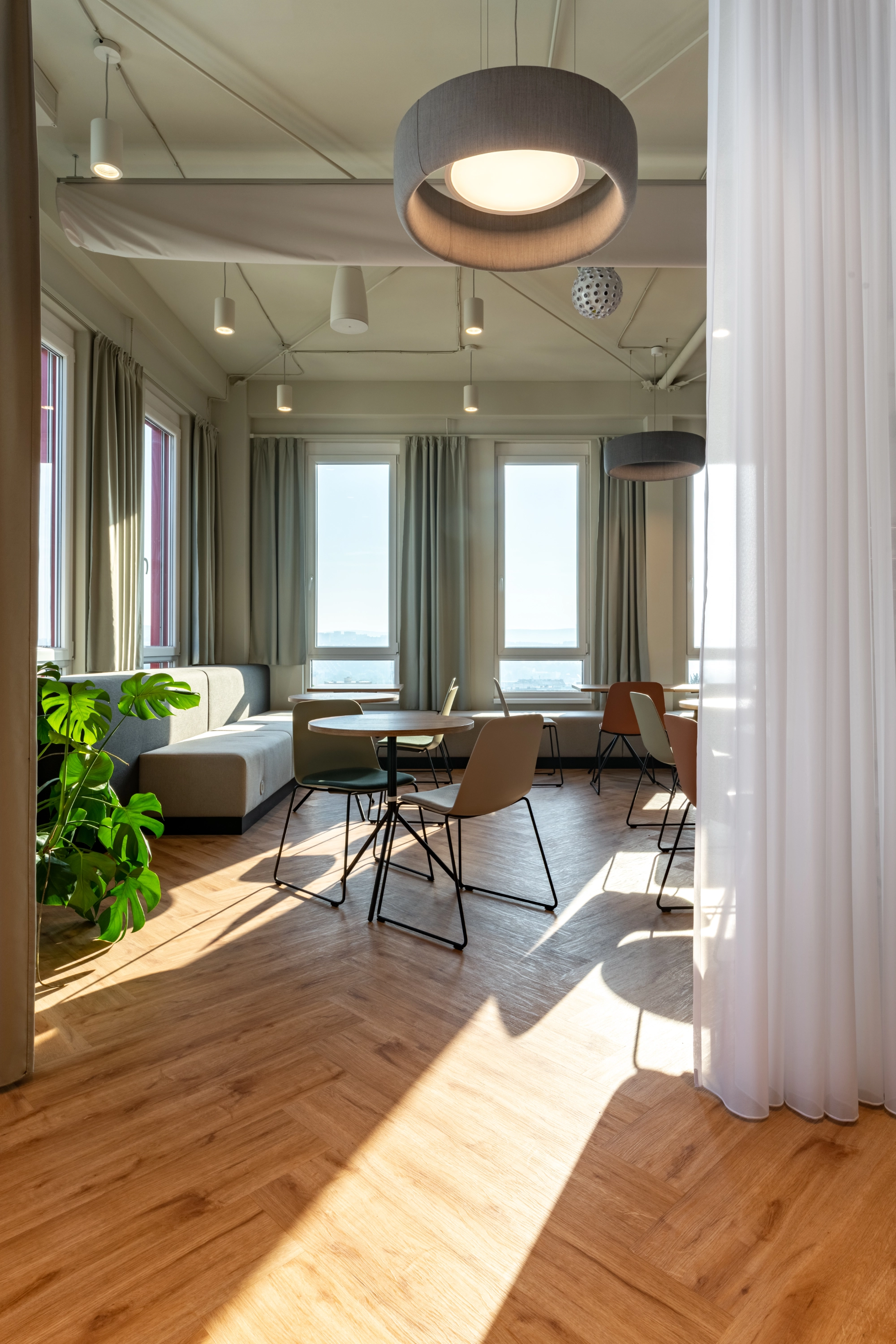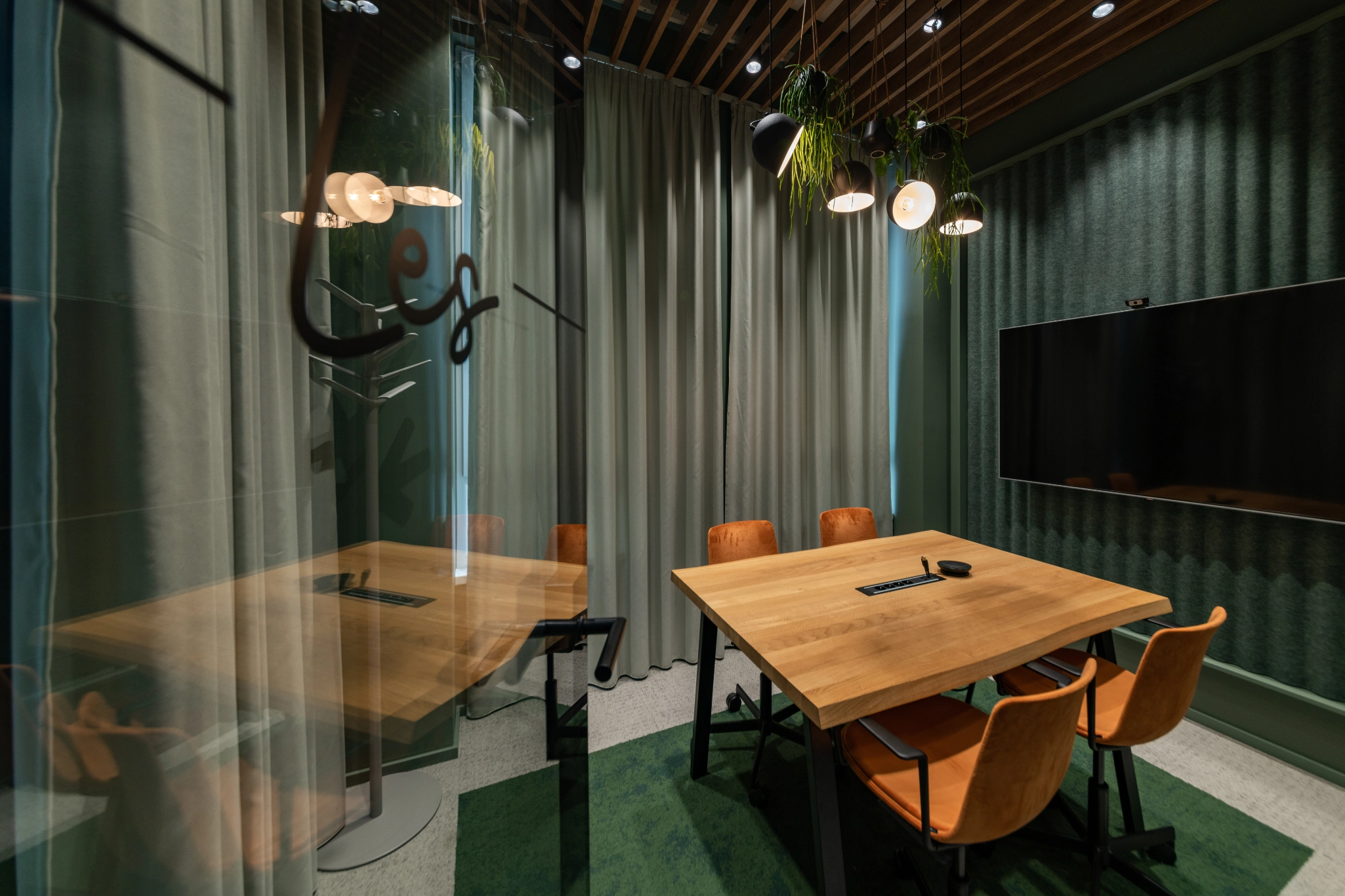 Vzniklo tedy zadání na kompaktní propojený prostor se stovkou pracovních míst na jednom patře. Cílem bylo navázat na domácí prostředí, ale podpořit jej moderním designem – dřevem, sklem, přírodními prvky, velkým množstvím zeleně, teplými barvami i měkkým světlem. Zároveň bylo potřeba reagovat na zásadní změnu způsobu práce a v rámci sdílených kanceláří vytvořit místa pro setkávání: WorkCafé s velkou terasou, relax zóny ve druhém patře, fitko či nahrávací studio. Oříškem pak byla dispozice – stávající budova je specifická svojí značnou délkou a tomu musel být přizpůsoben celý koncept. V podlouhlém prostoru vznikla koncepce uzlů, které jednotlivé bloky propojují v řadě za sebou. Prostorová organizace je díky závěsům značně variabilní.