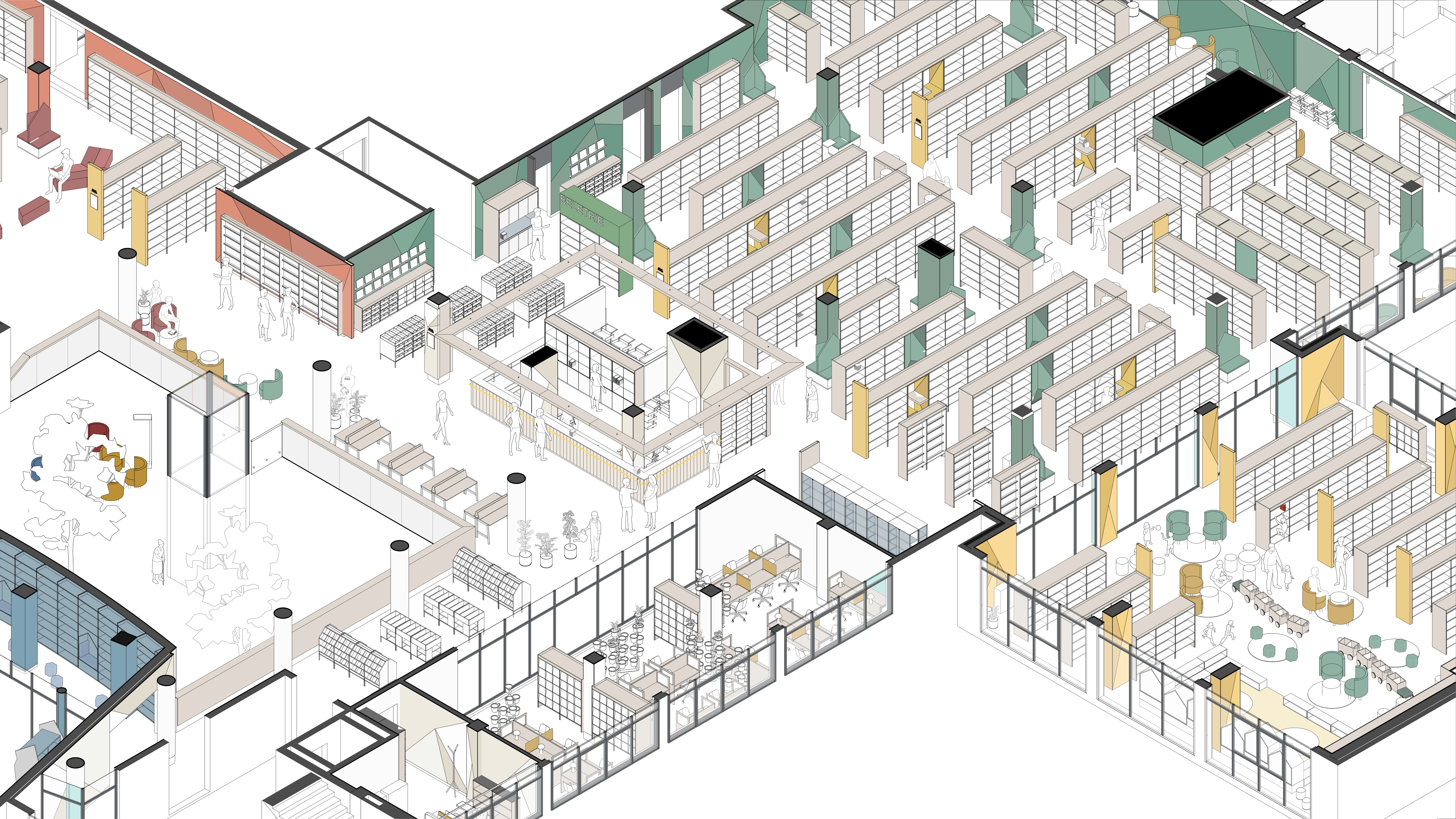 Vstupní část knihovny je tvořena prostornou dvoranou a je velmi důležitou součástí objektu. Jedná se o místo setkávání, prostor pro trávení času návštěvníků. Vnímáme ji jako vnitřní náměstí, kde se odehrává život knihovny, umocňují to také dva mumifikované stromy v centrální části. Součástí se recepce, skříňky pro návštěvníky a prostor čítárny s denním tiskem. Hlavní výpůjční prostor knihovny se nachází na úrovní 2. NP a je členěn na sekce. Pro dětské oddělení je využit uzavřený prosklený prostor na západní fasádě. V uzavřeném prostoru původního kinosálu je navržena mystická část fantasy.