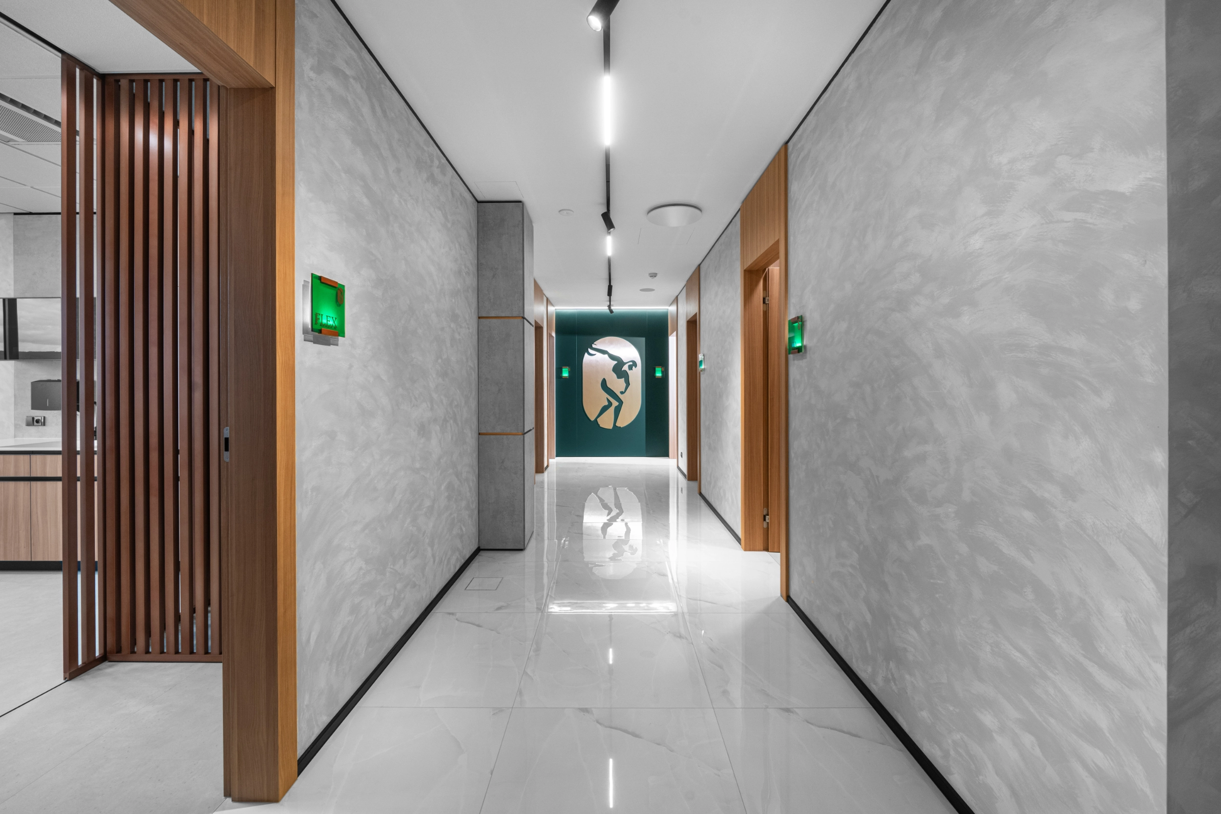 Materiálové řešení interiéru kombinuje luxus, energii a stabilitu. Hlavními prvky jsou dřevěné obklady stěn, obložení sloupů v dekoru kamene, energické zelené plochy v britské závodní zelené a třpyt mosazných akcentů a výrazného čalounění zlatých odstínů. Prostor je uklidněn lesklým mramorem ve veřejných částech a vinylovou podlahou s dekorem pískovce v ordinacích lékařů. Celkovou atmosféru dotváří moderní LED osvětlení, kombinující přímé i nepřímé světelné linie dynamických tvarů.