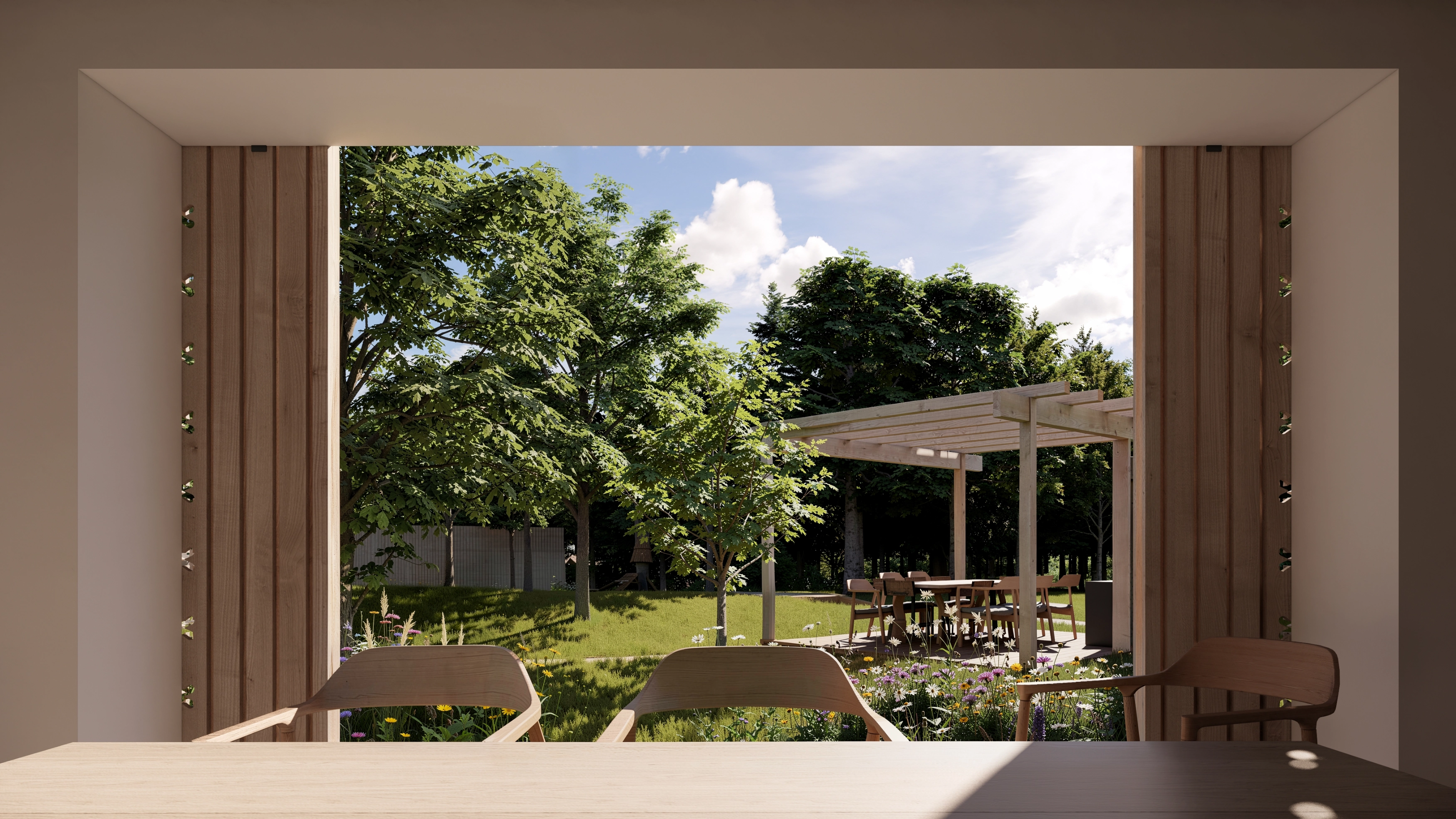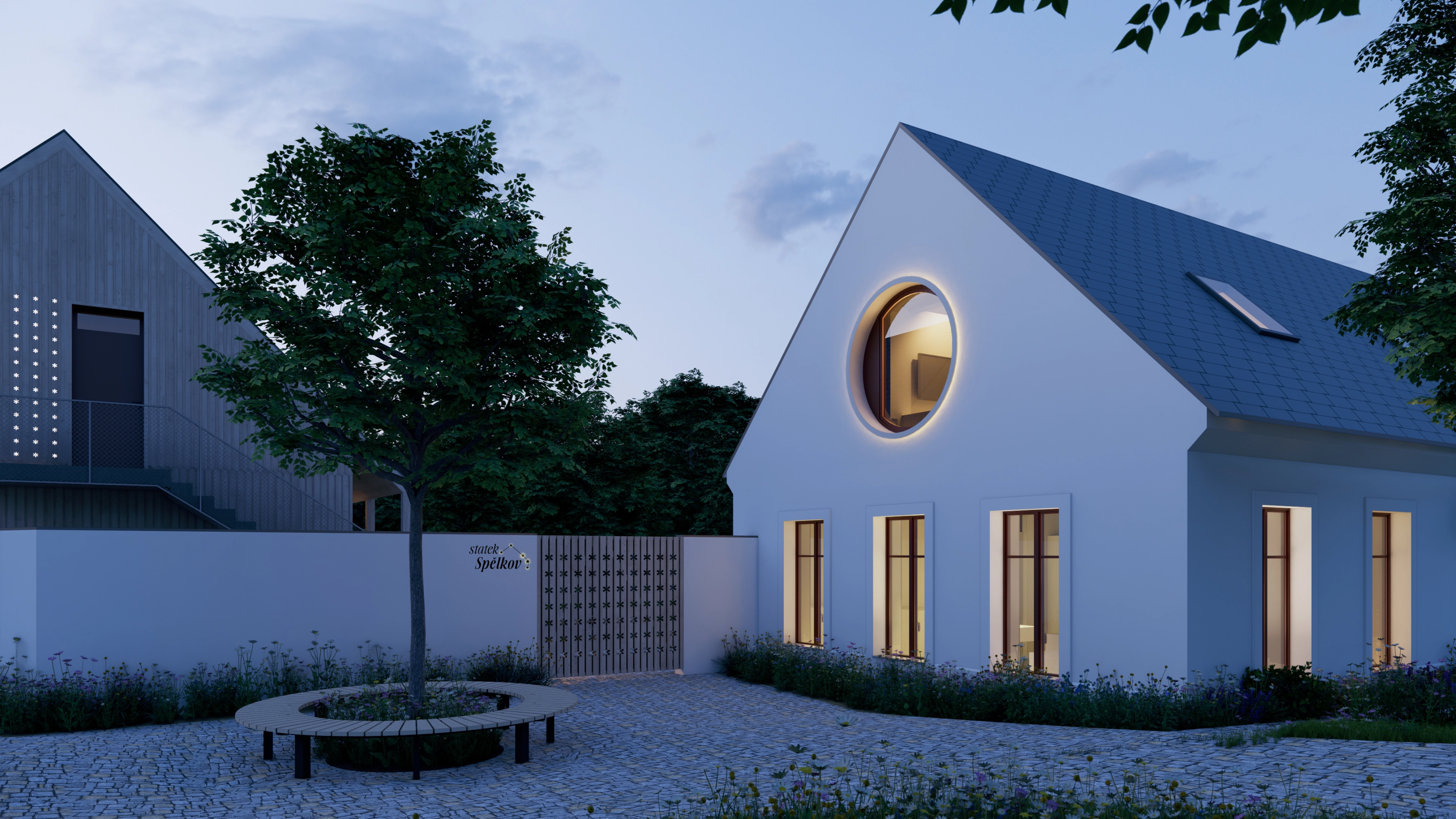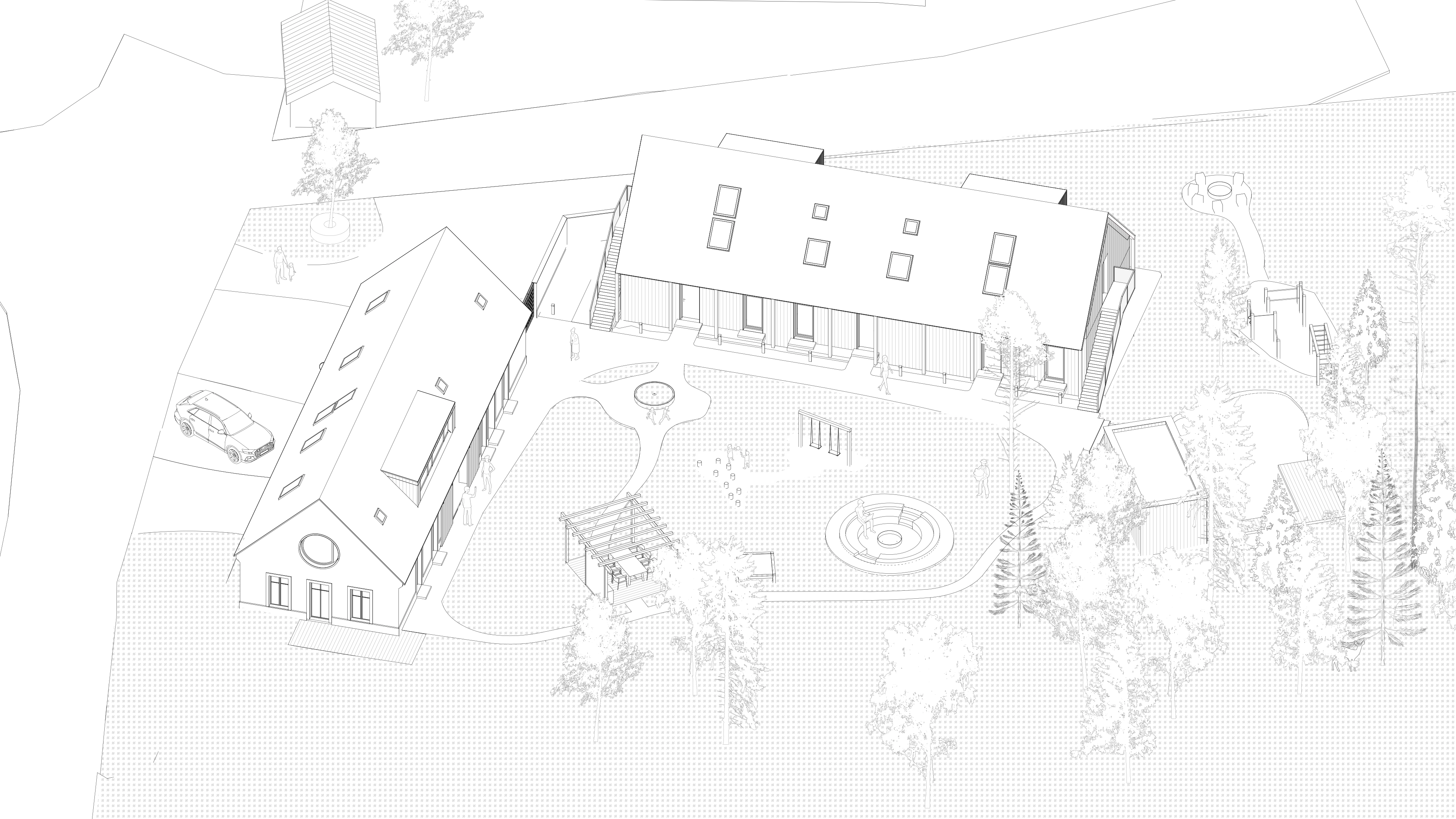Vnitřní dvůr slouží jako polo-veřejný prostor pro vstup i každodenní pobyt. Na něj navazuje zahrada volně přecházející do krajiny, členěná do menších pobytových zón. Ty umožňují paralelní využití různými skupinami a vytvářejí různorodé prostředí pro relaxaci i společné aktivity. Součástí areálu je přírodní koupací jezírko se saunou, venkovní kuchyně, ohniště a další prvky podporující pobyt v exteriéru. Celé řešení doplňuje jednoduché oplocení respektující venkovský charakter místa.