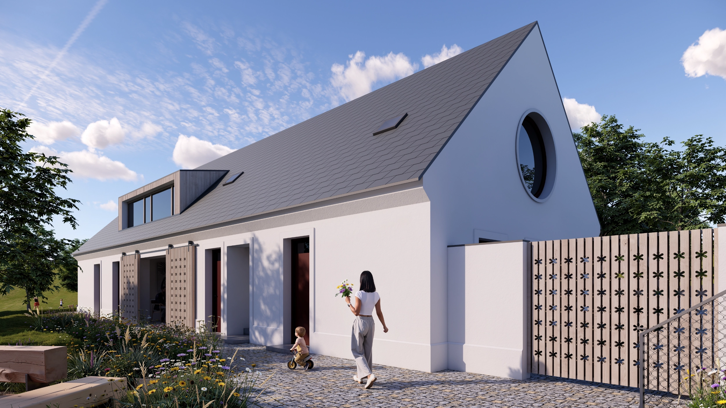 Koncept navazuje na archetyp venkovské usedlosti s uzavřeným dvorem. Dvě základní hmoty – hlavní dům a stodola – jsou propojeny do kompaktního celku a vytvářejí jasně čitelnou strukturu areálu. Návrh pracuje s reinterpretací tradičních principů místní architektury a přenáší je do současného výrazu.