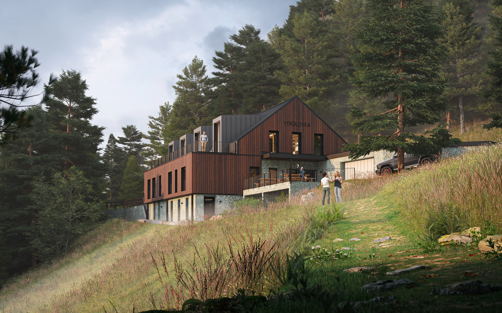 Nadčasové a minimalistické tvarosloví chaty Vendlovky doplňuje materiálové řešení, které kombinuje lokální přírodní materiály a moderní prvky. Fasáda je obložena jedlovým dřevem, typickým pro tuto oblast, a hrubé povrchy, včetně zídek a obkladů, jsou z místního vápence.