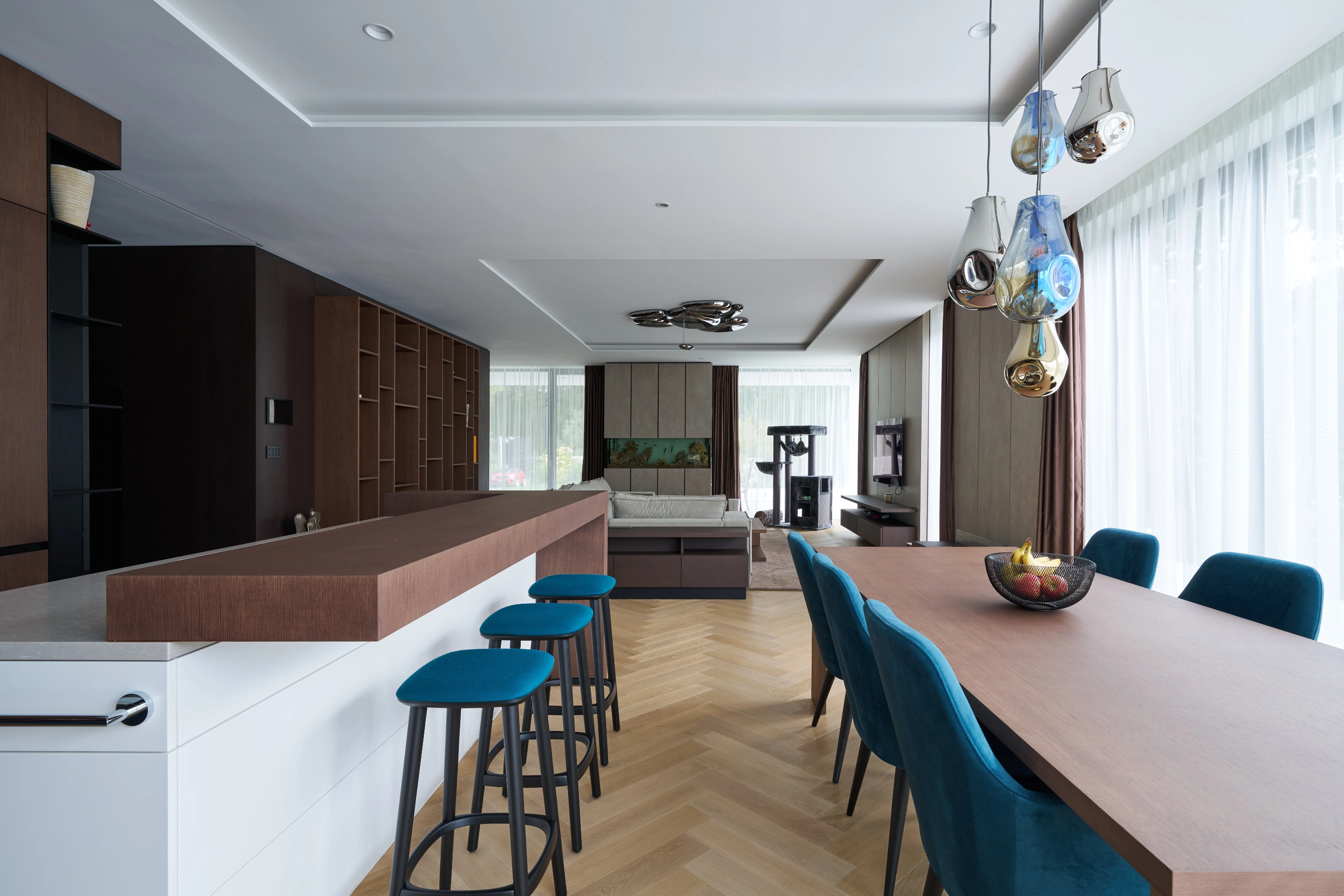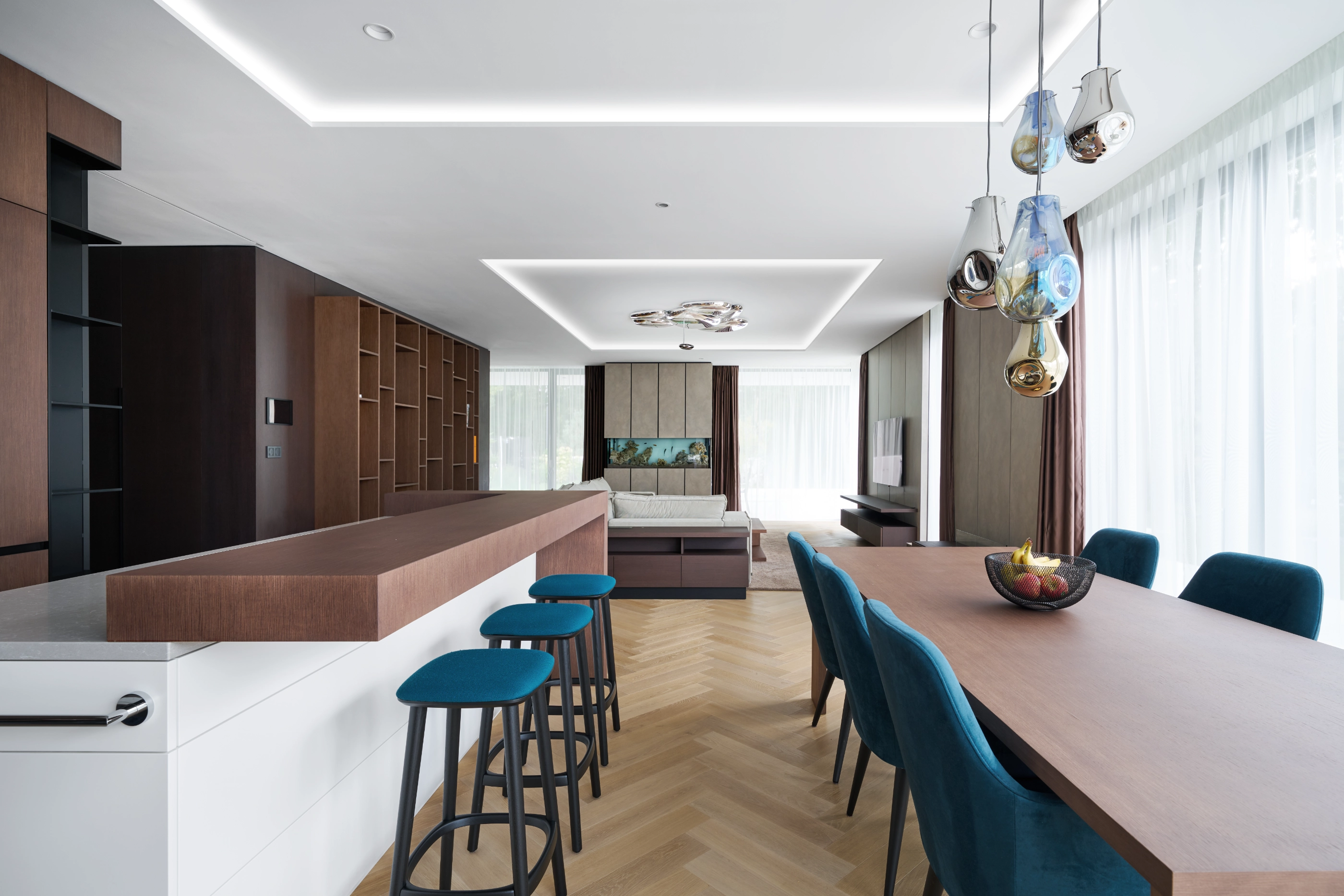 Objekt je tvořen dvěma nadzemními podlažími a je podsklepen. Sklep je mozkem celého domu, jelikož se zde nacházejí veškeré technologie a řídící jednotky. Samotný dům je vybaven prostornou kuchyní spojenou s obývacím pokojem, knihovnou, velkou šatnou, luxusními ložnicemi a koupelnami. Nad garáží se navíc nachází apartmánový byt nabízející samostatnou bytovou jednotku s vlastní kuchyní a koupelnou.