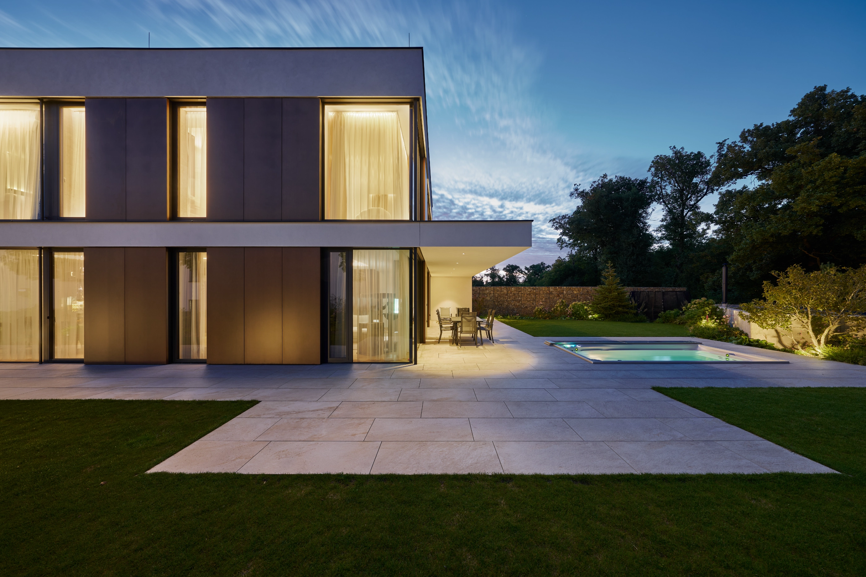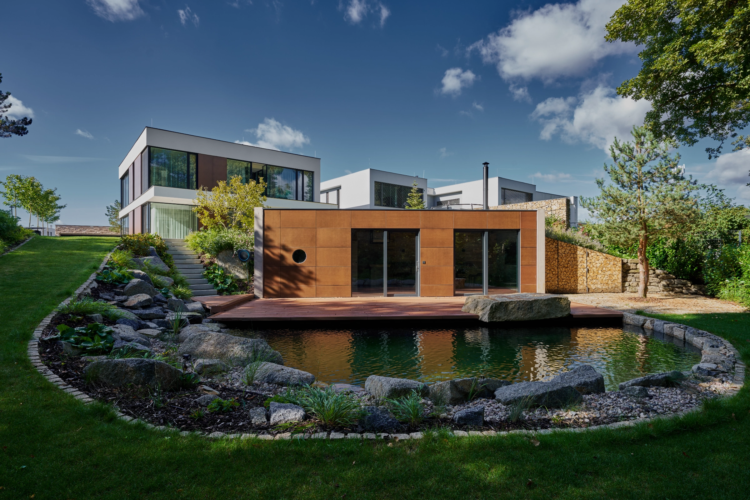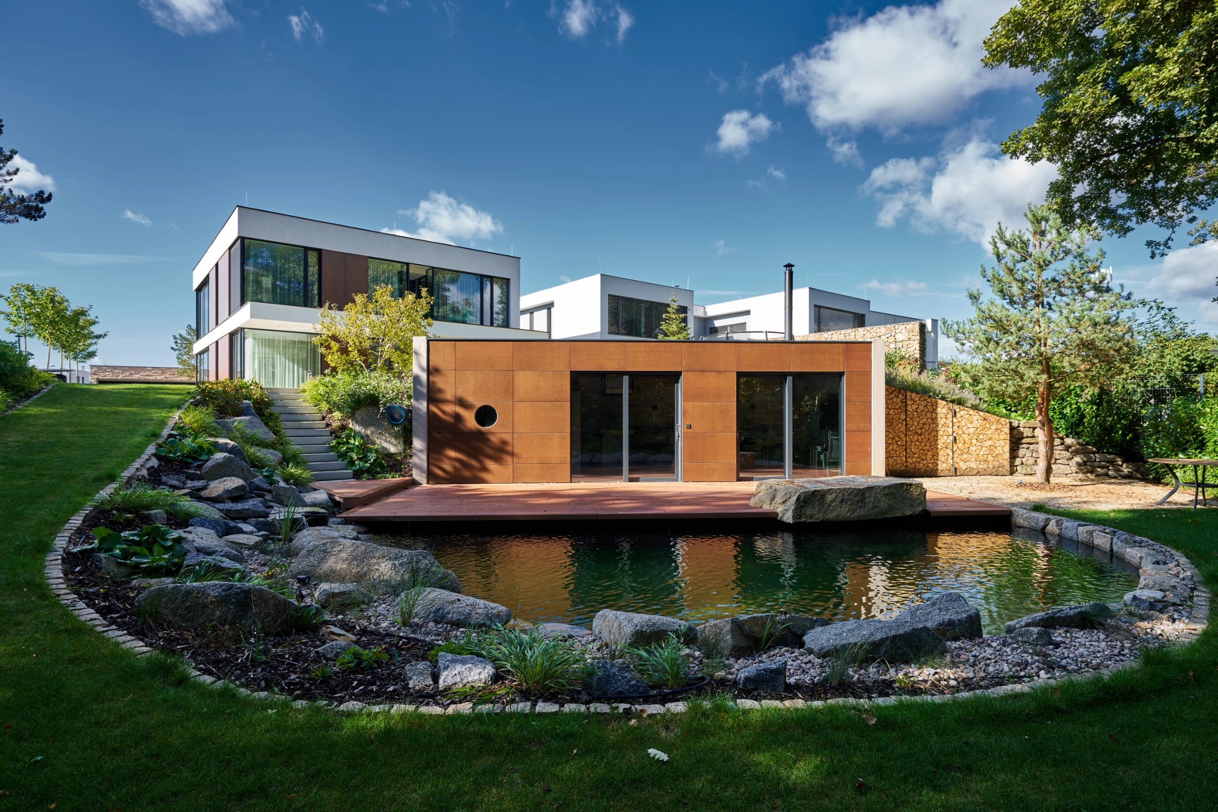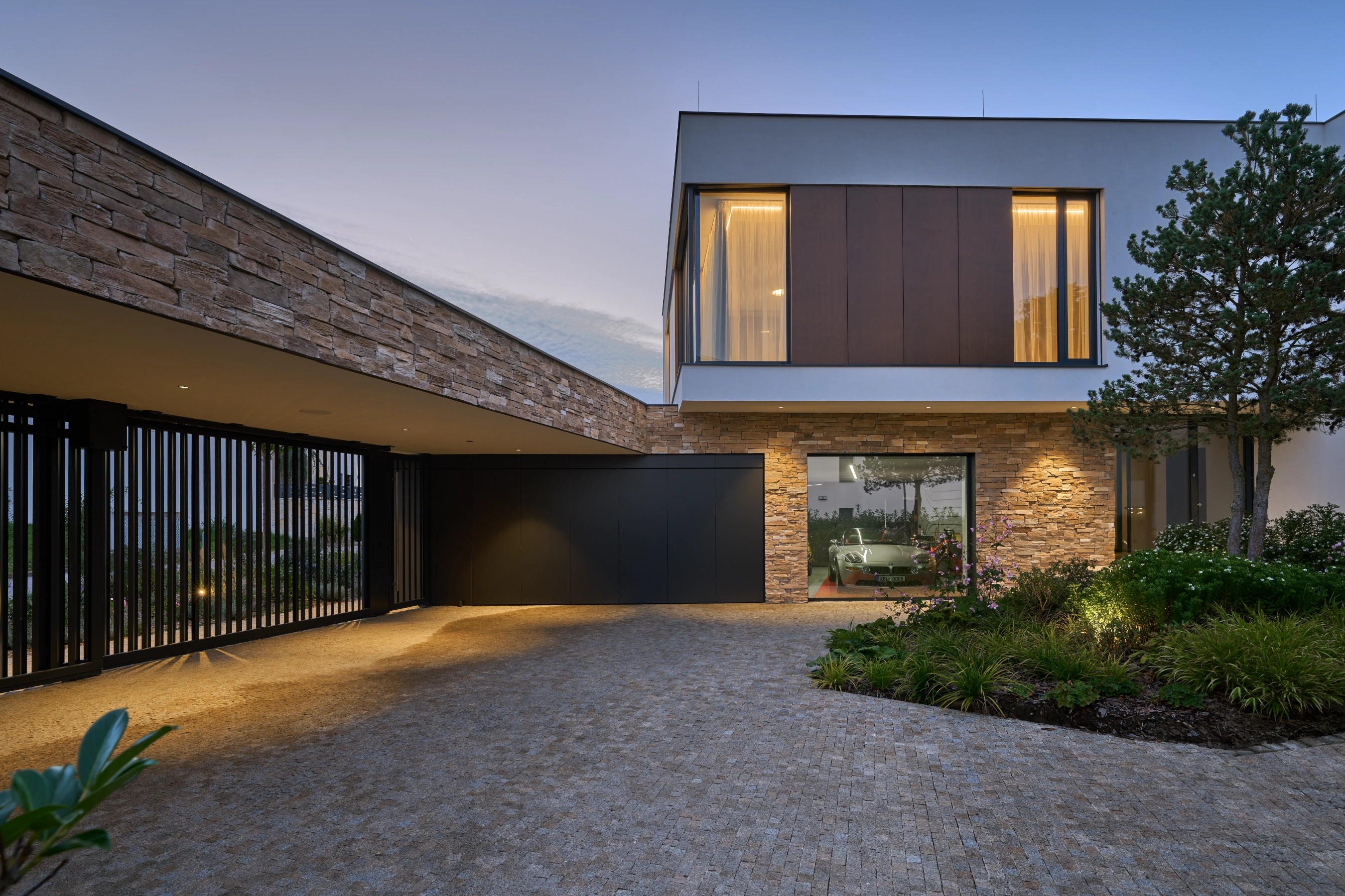 Základní myšlenkou je moderní bydlení spojující klid, luxus, pohodlí a soukromí. Výsledný vzhled působí majestátně a zároveň decentně kombinuje prvky minimalismu se svéráznou svébytností a osobitým charakterem. Soukromí zajišťuje vhodná orientace oken, stínící technika a mohutná vjezdová brána z plechových lamel. Za ní je ukrytý vjezdový dvůr a velkorysá garáž pro ustájení nekolika vozidel. Dům dopňuje velká zahrada s vířivkou, jezírkem a zahradním domkem, který si svým materiálovým řešením bere inspiraci z hlavní budovy a nabízí zázemí pro relax s přáteli. Celý dům je řízený systémem chytré domácnosti.