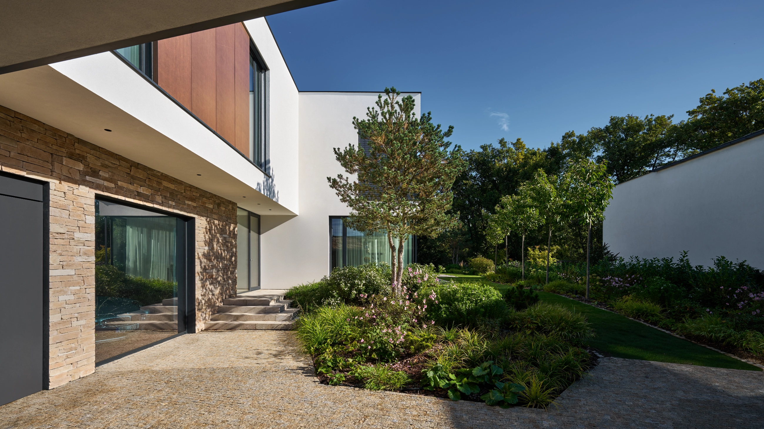 Rodinná vila nedaleko centra Brna, jejíž sousedem je les. Budova navržena dle aktuálních trendů moderní architektury, chránící soukromí obyvatel ze stran veřejných přístupů a pohledů, se naplno otevírá do zahrady. Ta se ve své délce svažitě mění na lesní stráň a z interiéru se tak nabízí úchvatný výhled na přírodu, se kterou je díky velkorysé ploše prosklení propojen. Propojení s okolním světem zajišťuje prostorná garáž. V návrhu bylo myšleno i na nejmenší obyvatele. Dům je vybaven skrytými dvířky pro kočky s čipovým klíčem.